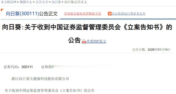2026年1月14日,向日葵(300111)公告收到中国证监会的《立案告知书》(编号:证监立案字01120260003号),因公司涉嫌信息披露违法违规,中国证监会决定对公司进行立案。上海海汇律所梁律师提示:2025年9月22日(含)至2025年12月25日(含)期间买入该股,且在2025年12月25日闭市后当日仍持有的受损投资者可在公众号"公义之星"申请索赔挽损。股票索赔的是历史法定损失金额,与目前是否持有股票没有关系。